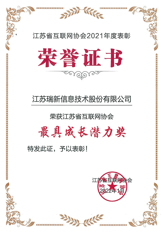 近日,我司獲評2021年度江蘇省互聯網協會“最具成長潛力獎。”