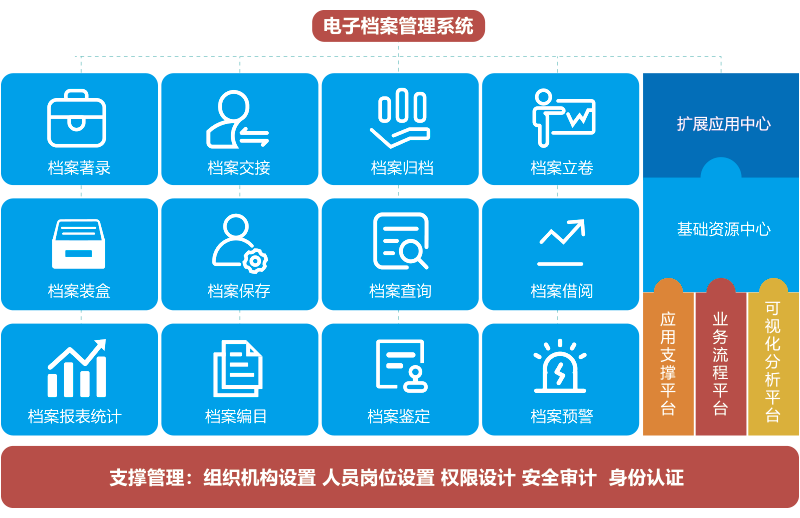 智慧檔案管理系統實現文書、科技、人事、會計、音像、專業、實物等檔案管理,涵蓋形成與收集、整理與歸檔、保管與保護、鑒定與銷毀、利用與開發、統計與移交全過程規范化管理,提供檔案管理與服務,滿足檔案者和利用者實際使用需求,全面提升檔案管理的規范性、高效性、智能性、便利性、安全性。